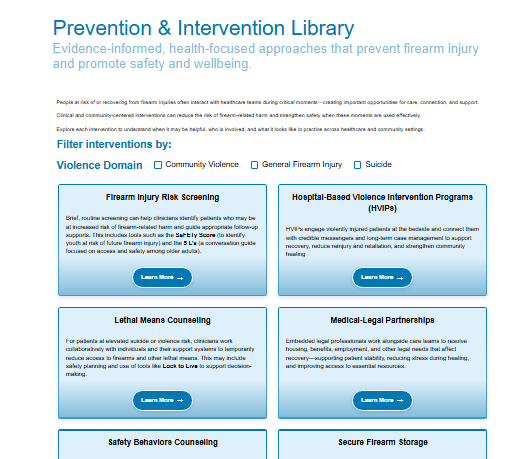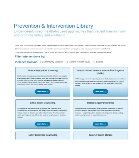 The Center - powered by the HAVI - has created the Prevention & Intervention Library so that healthcare systems and providers can turn that opportunity into action. The Prevention & Intervention Library is a centralized resource with curated, proven, health-focused firearm injury prevention strategies for clinical and community settings.